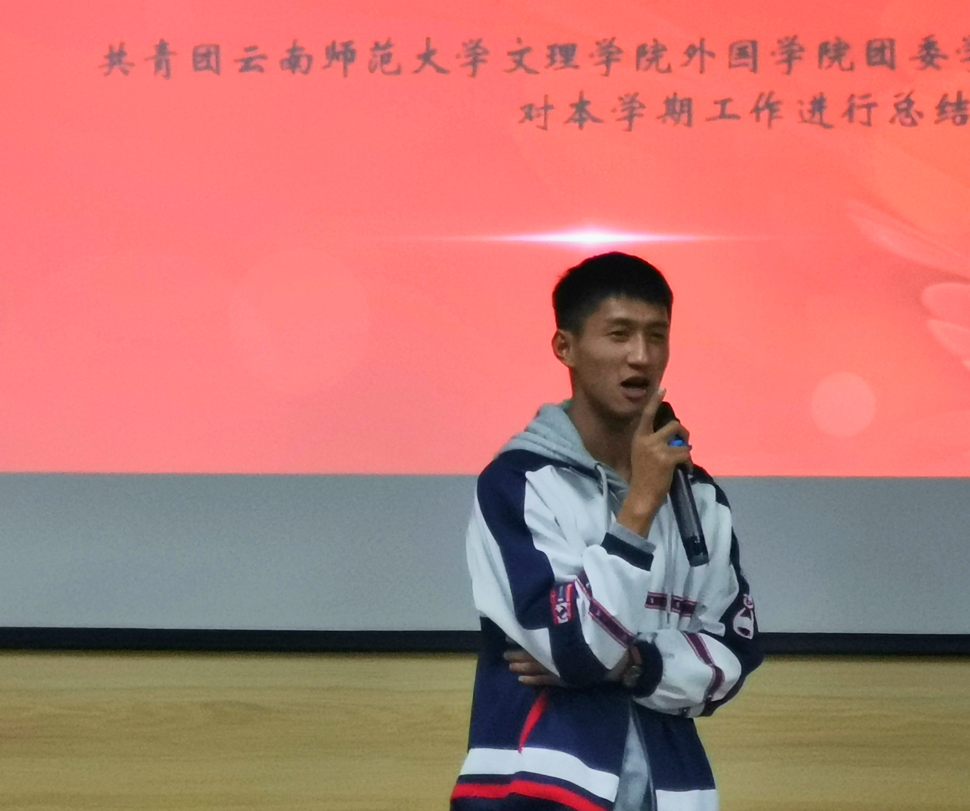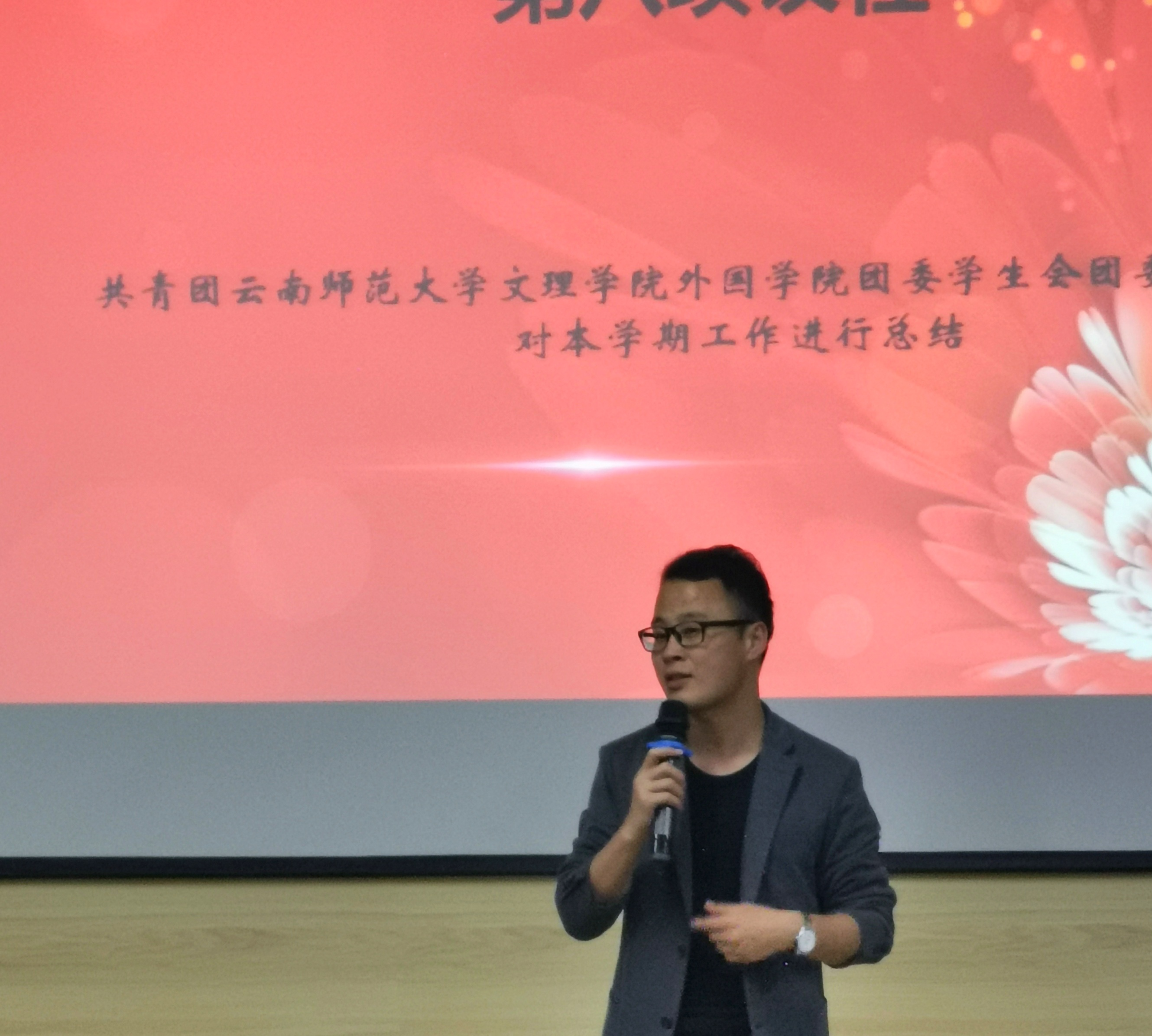 共青团云南师范大学文理学院外国语学院外国语学院团委书记贾大朋老师做总结。老师祝贺并热烈欢迎了新干事的加入,分享了一些工作经验,鼓励大家在组织里一定要认真负责,遇到问题时不气馁,摆正态度,不忘初心,砥砺前进。
