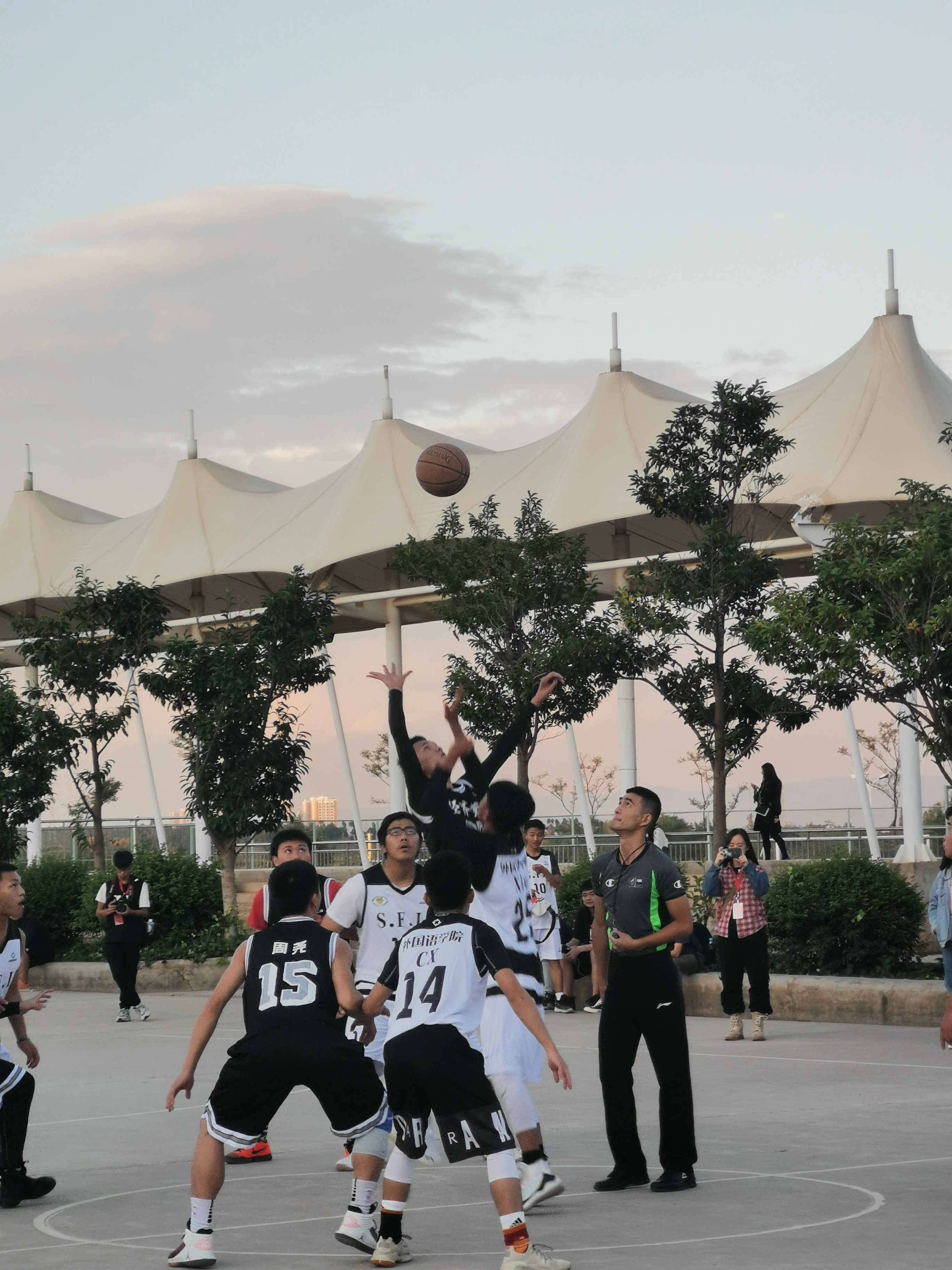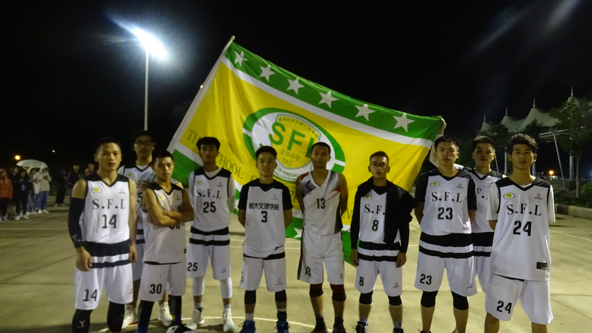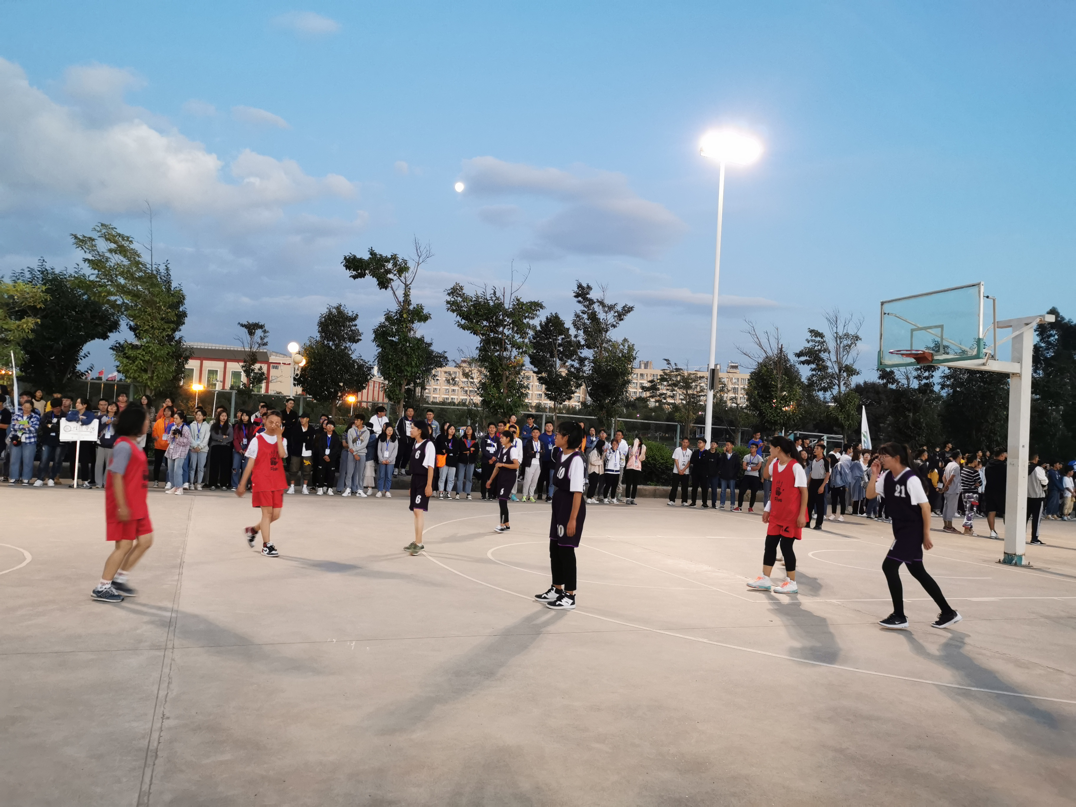 10月10日下午六点,比赛还未开始,属于外国语学院男子篮球队一展身手的3号场地早已人山人海,外国语学院的观众们都期待着篮球健儿们的精彩表现,为他们加油为他们打气。篮球场上,为了赢得此次比赛,外国语学院的篮球健儿们纷纷摩拳擦掌、枕戈待旦。伴随着裁判响亮的哨声,篮球比赛开始了!