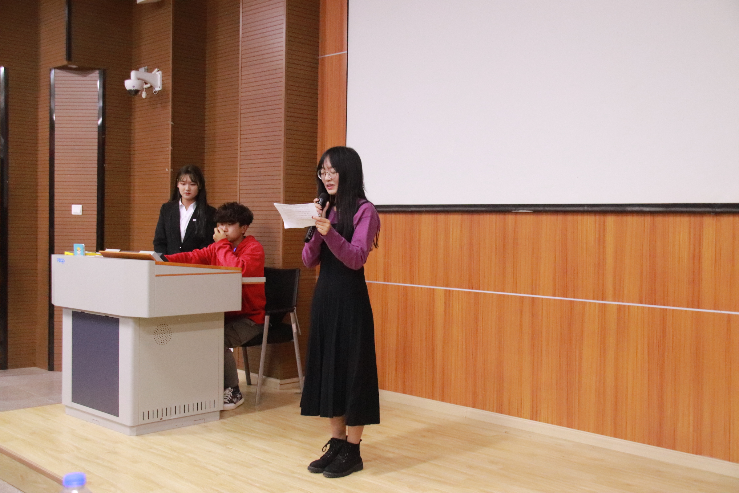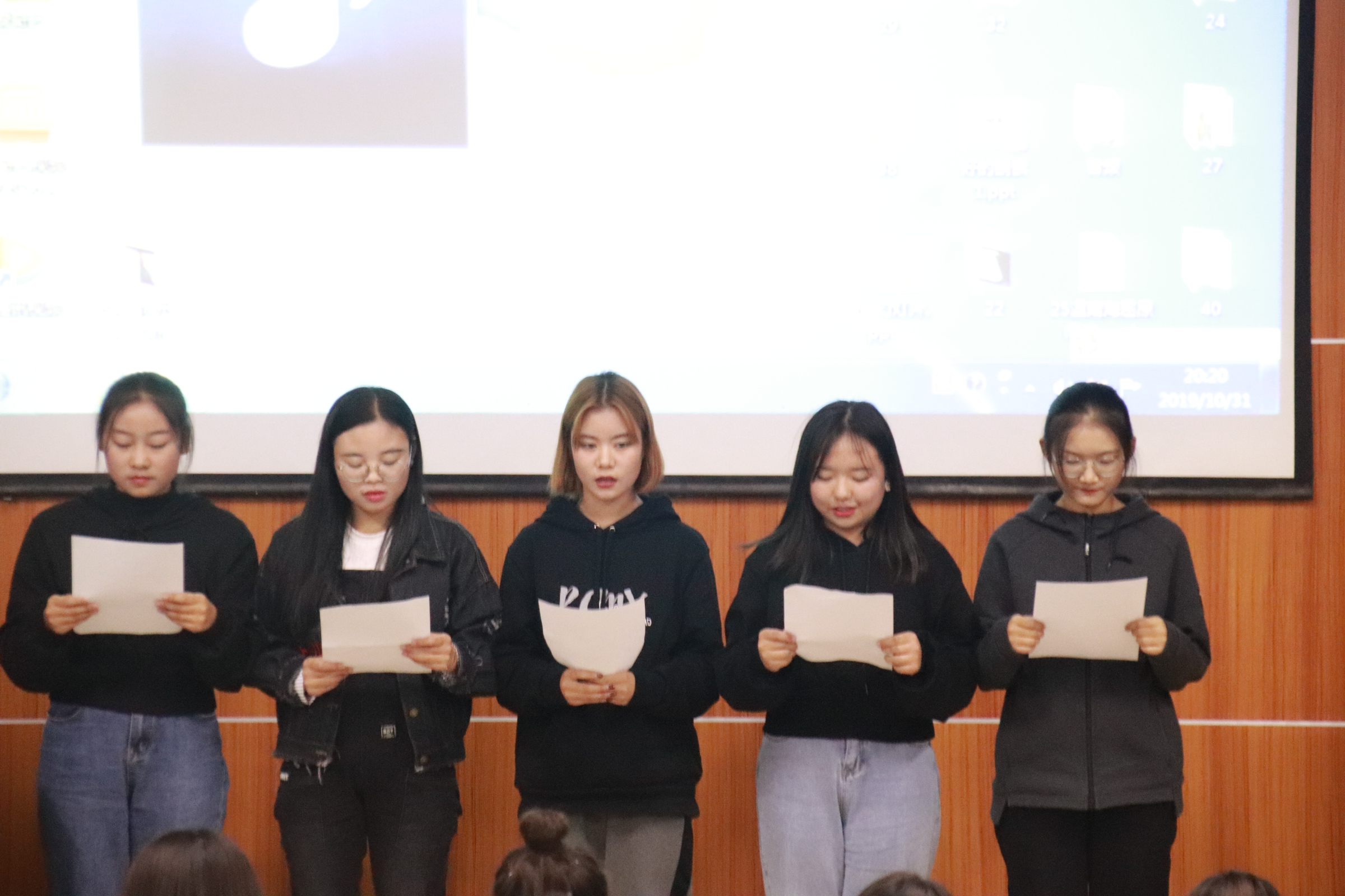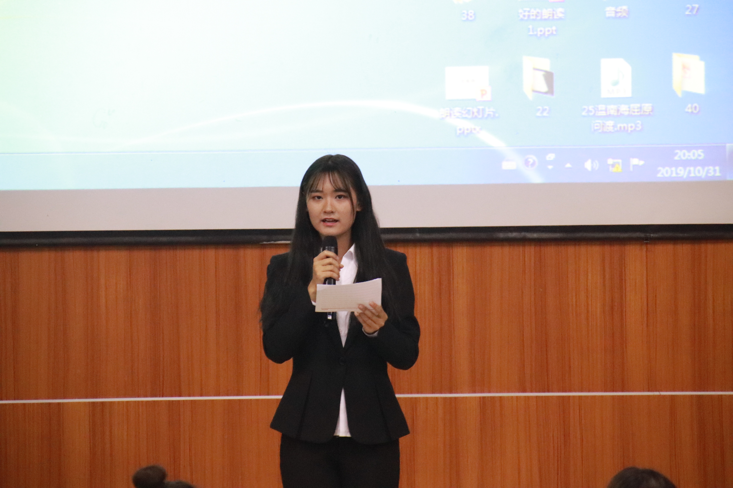 比赛按参赛者的抽签顺序进行,大家精心准备的背景音乐或PTT在比赛前就已拷贝完成。对于此次比赛,每个选手都做了充分的准备,也都将自己的情感表达得淋漓尽致。其中,给人们留下深刻印象的是19级英语A班 伍乡、包釴、张瑶、李卉、陈静洋小组,诵读篇目为《出师表》,她们上台礼貌有序,感情丰富、引人入胜,准确把握作品内涵与格调,并且在诵读时将原文翻译成英语穿插诵读,充分展现了外国语学院的特色,这样别有风味的诵读让人眼前一亮。给人留下深刻印象的还有18英语D班 李慧敏,杨佳郦小组,诵读篇目为《蒹葭》,她们普通话发音准确,吐字清晰、声音洪亮,节奏鲜明,时而温雅磁性,时而松弛有度,时而如涓涓流水润泽心灵,如高山流水一般牵动听众心弦。古文加白话文的表演方式更是增加了整首诗的韵味!