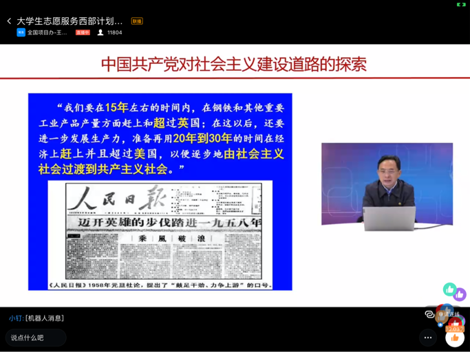 本次党史培训专题依托“钉钉”平台,进行线上网络教学。我校工作站于3月25日组织各志愿者进行设备调试与流程测试,并积极反馈相关问题,为培训的顺利进行做好充分的保障。中央党校党史研究部祝彦教授,聂文婷副教授从中国共产党领导人民进行新民主主义革命的历史,中国共产党领导人民进行社会主义革命和建设的历史,中国共产党领导人民进行改革开放的历史,中国共产党领导人民奋进新时代并取得伟大胜利的历史四个阶段,为志愿者们讲授了中国共产党的百年党史。以生动鲜活的历史实例、优秀的党员事迹,绘声绘色地讲述了在中国共产党的领导下,中华民族从站起来到富起来再到强起来的伟大飞跃。