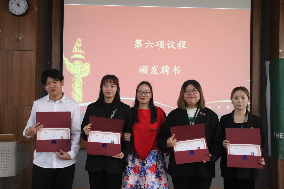 随后外国语学院学生会副主席马胜锲对在本学年团委学生会中表现突出、成绩优异的干事颁发优秀干事奖状;外国语学院团委副书记杨晓蕾宣读任免决定,公布了新一届团委学生会主席团人员以及下属部门负责人名单。紧接着为上一届外国语学院团委会主席团成员和各部门负责人颁发了聘书。