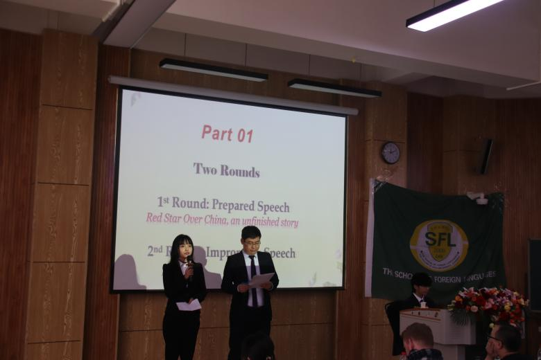 本次决赛包括两个环节:定题演讲和即兴演讲。在第一环节,参赛选手需以Red Star Over China, an unfinished story为题,进行为时3分钟的英语脱稿演讲,并回答评委的提问,在即兴演讲环节,选手需就所抽选的题目进行回答,限时2分钟。