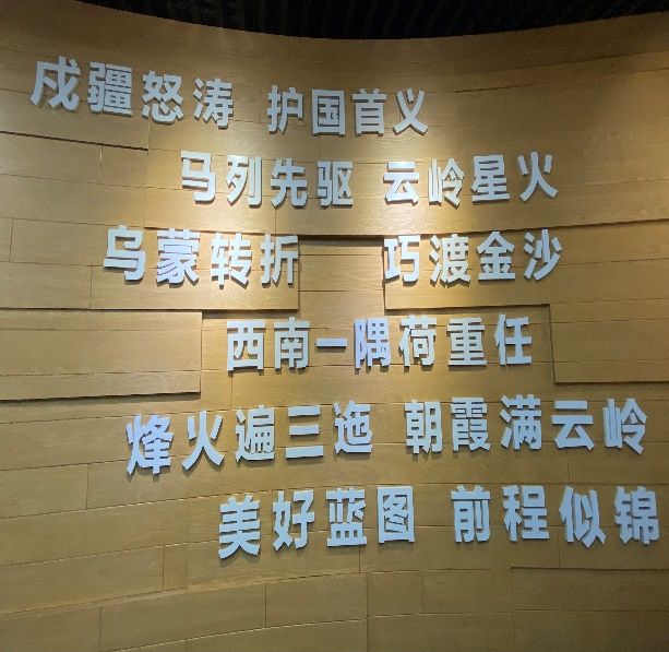 在现代的声、光和电的科学技术形象中、在照片和文字中,我们仿佛亲临其境:陆军讲武学堂和蔡锷领导的;重九起义;,护法讨袁推翻云贵总督李经義的清政府政权;接着是马列主义传入云南,云岭星火照亮西南大地,龚自知创办《云南日报》,以舆论为武器,宣传新思潮;接着是红军长征在云南的历史记录,如扎西会议、巧渡金沙江、乌蒙回旋等重大事件;接着是云南人民为世界反法西斯侵略斗争做出的巨大贡献;接着是无数人民英雄用生命构筑的滇缅公路、洒血松山苦战、驼峰航线的开通;而如今,云南省各项事业取得突飞猛进的成就,人民生活幸福就是对最后一部分美好蓝图,前程似锦;这个标题最好的诠释。