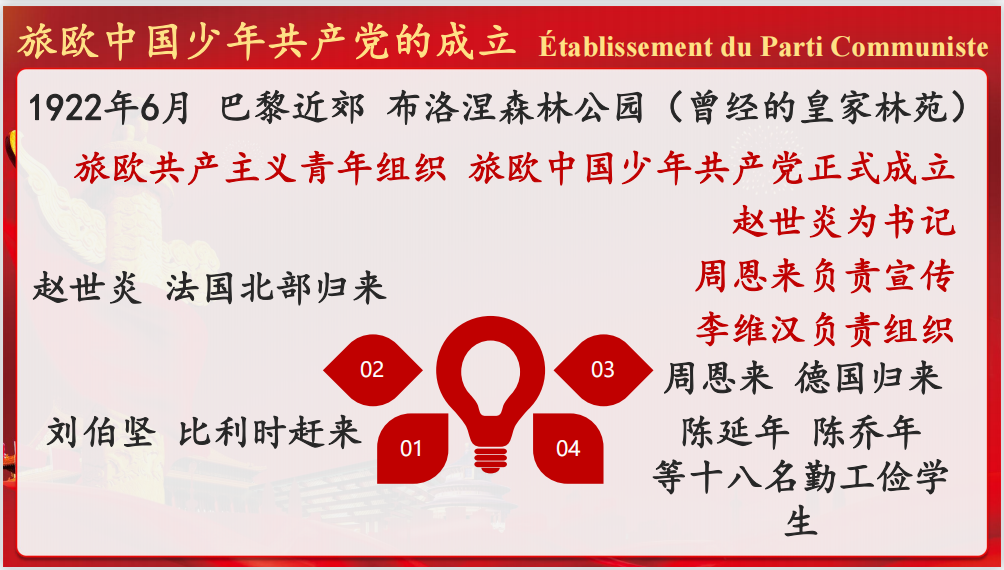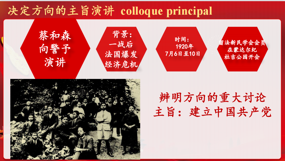 正值2021年中国共产党成立百年之际,教学设计以党史专题的思政融入教学。此次比赛的主题为《唯家与国 不负韶华 --- 留法勤工俭学运动中的中国共产党人》,讲述了中国青年在一百年前的留法勤工俭学运动中进行了辨明方向的重大讨论,与嘉兴南湖中国共产党1921年7月成立相呼应,旅欧中国少年共产党于1922年6月在巴黎西郊布洛涅森林里召开成立大会。