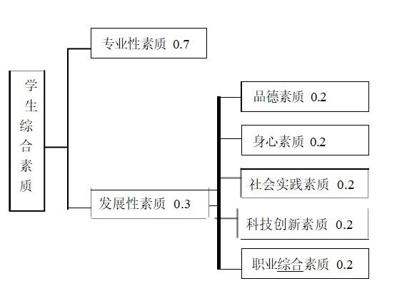 第十二条综合测评成绩计算方法。综合测评成绩=专业性素质× 70%+[品德素质×20%+身心基础素质×20%+社会实践素质×20%+ 科技创新素质×20%+职业综合素质×20%] × 30%。