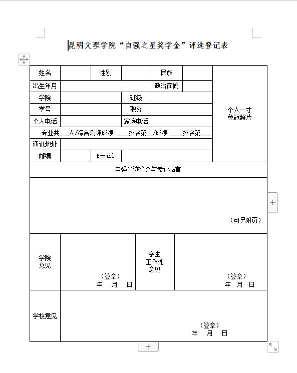 2、《昆明文理学院自强之星候选人登记表》