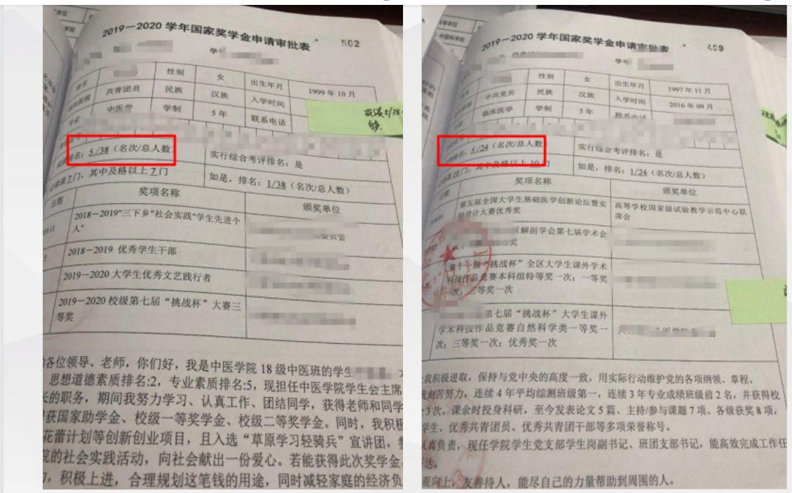 要求:“学习成绩排名”“综合考评排名”学生总基数应结合实际 ,应以班级或者本专业实际总人数为基数 ,不能随意扩大。评审过程中发现有学院将全院学生纳入总基数。