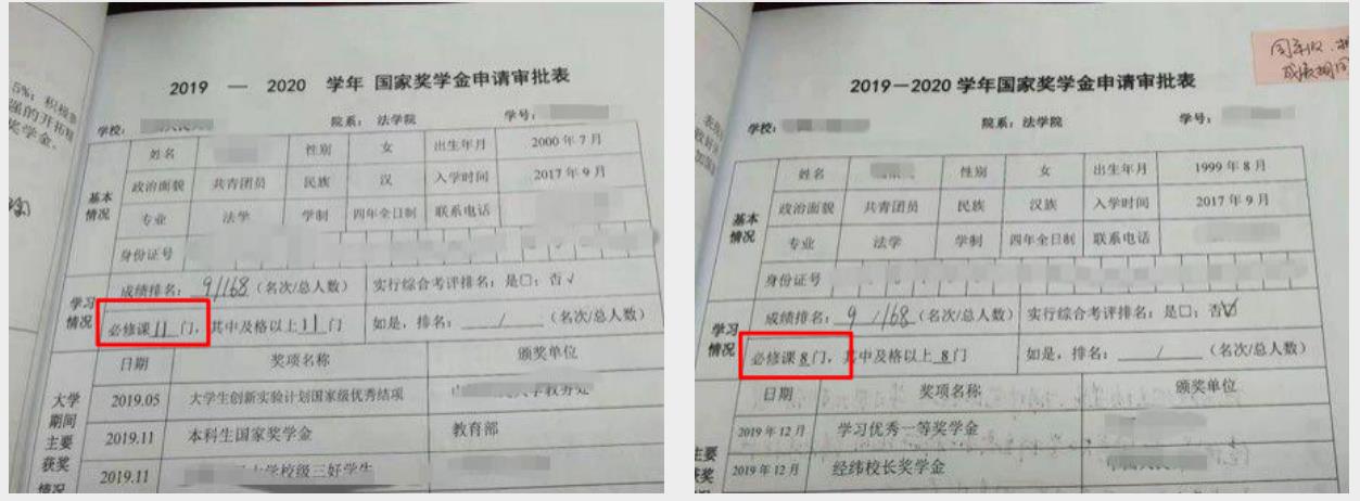 同年级同专业的两位学生 ,必修课程数量不一致,一个是11门,一个是8门,且无支撑材料。