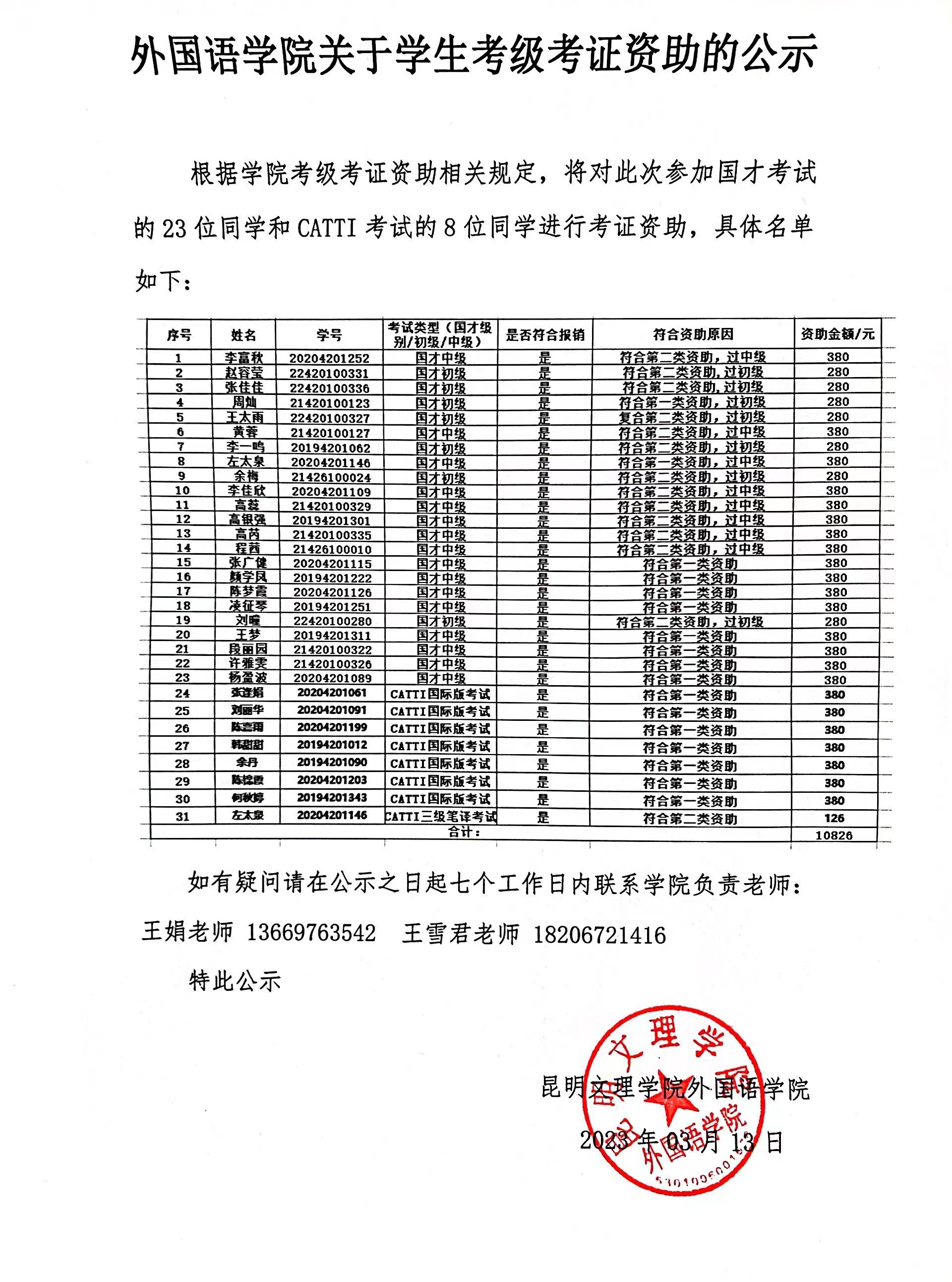 外国语学院关于考级考证资助公示 发布时间:2023-03-14 作者:admin 根据外国语学院关于考级考证资助相关规定,现将涉及符合资助学生名单作如下公示,如有异议请在今日起七个工作日内联系学院负责老师:王娟 136 6976 3542 王雪君 18206721416