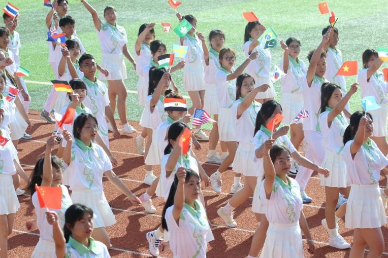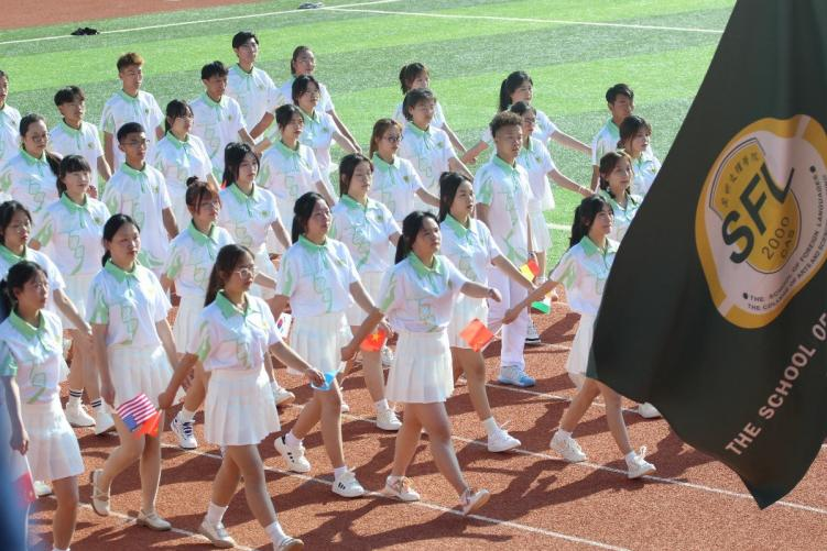 外国语学院方阵队迈着整齐的步伐、身着节日盛装,手中紧握五星红旗,步履坚实而有力量向我们走来。