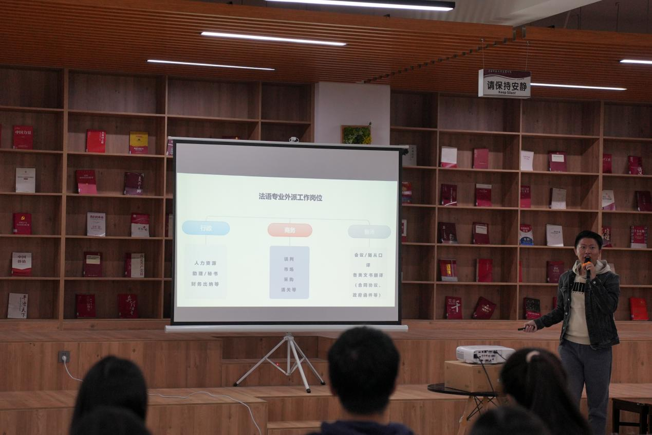 张老师结合自身工作经历,为同学们分析了法语专业学生就业现状,让学生们了解行政、商务、翻译、国企、基建、援外和教学等相关行业的就业前景;分享了其在工作中的收货,并和学生一起探讨如何在就业市场中展示法语的专业优势;同时详细介绍了申请法国研究生的流程,强调了材料准备、语言要求、简历撰写,面试技巧等事项。