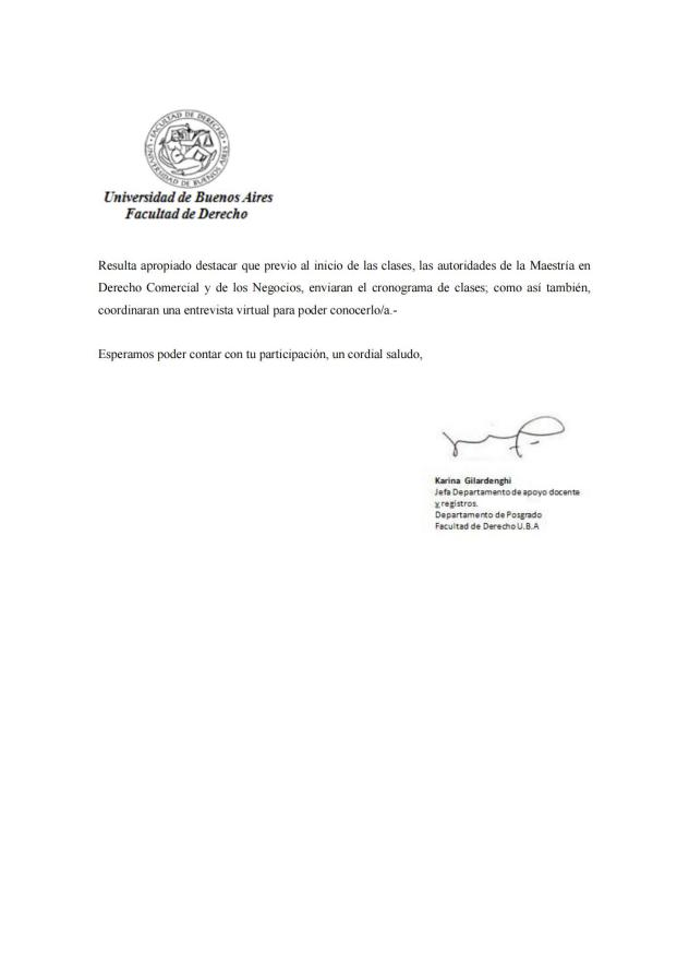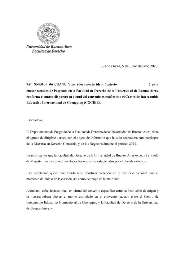 (常雨洁同学获得的布宜诺斯艾利斯大学商业法律硕士录取通知书)