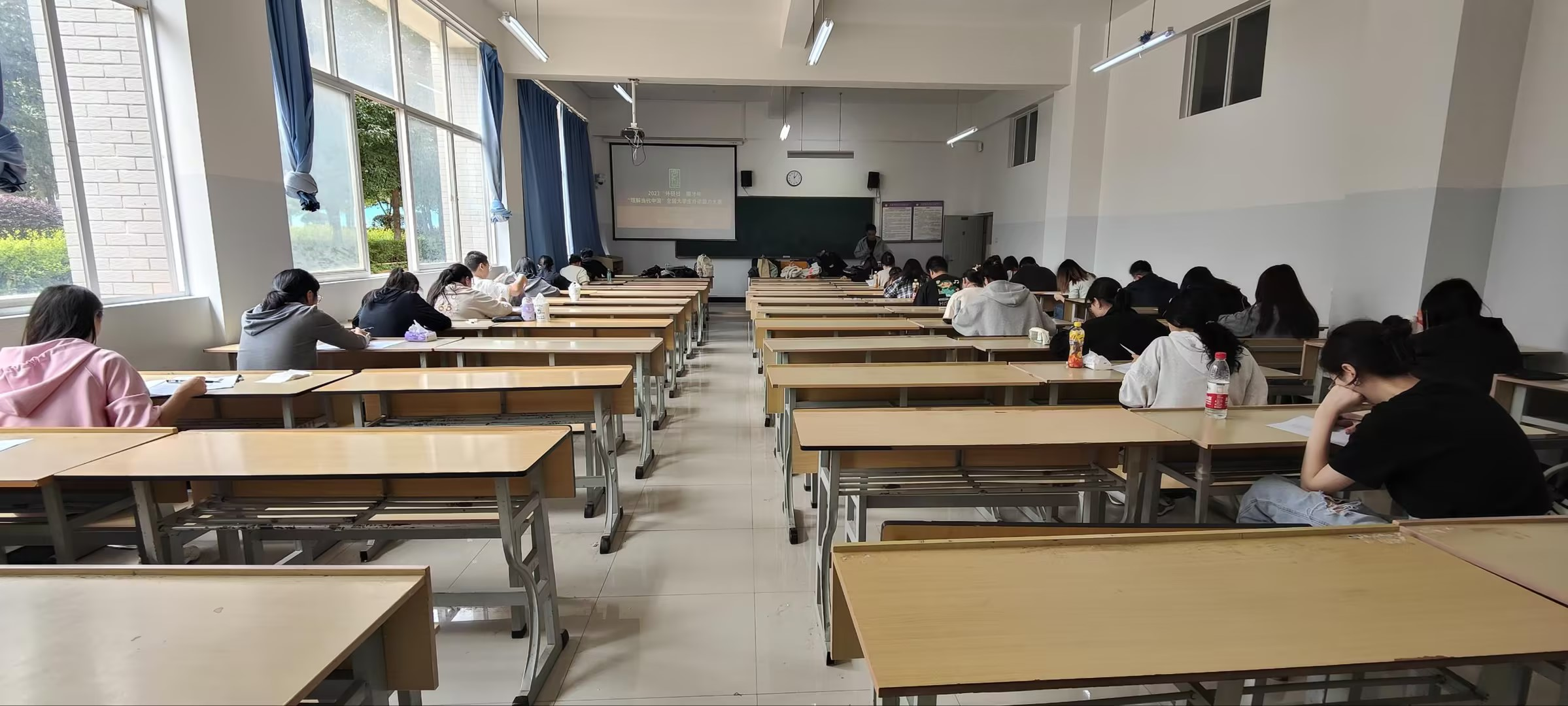 昆明文理学院外国语学院欧洲语系法语、西班牙语专业于2023年9月13日12:00-14:00在杨林校区A108教室以综合考形式组织线下比赛,参赛学生共计31名,其中法语专业22名,西班牙语专业9名。法语专业负责人方敏老师和西班牙语专业负责人牛璇老师严格监考,赛场纪律严明。综合考试题型主要为阅读理解、完型填空、汉外笔译和书面表达,内容涉及理解当代中国系列教材《汉法翻译教程》、《法语读写教程》、《汉西翻译教程》、《西班牙语读写教程》及党的二十大报告多语种版本内容。