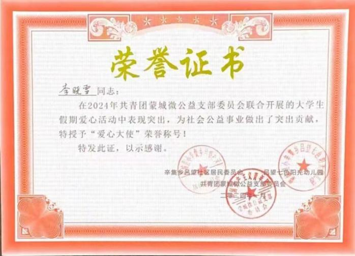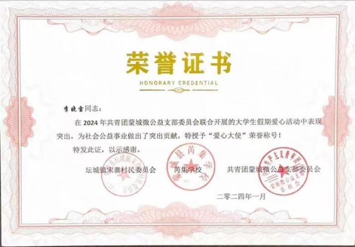 近日,外国语学院党总支收到了共青团蒙城微公益支部委员会寄来的一封感谢信,信中表达了2020级英语专业李晓雪同学在参与该公益支部委员会联合开展的大学生假期爱心活动中,展现出了高度的爱心和责任感,授予该同学爱心大使荣誉称号。