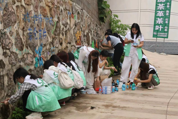 7月14日,实践团依据忙肺村独特的自然景致与深厚的乡村文化底蕴,紧密围绕乡村振兴的宏伟蓝图,精心考量墙体绘制的每一寸空间,为该村敲定了墙绘样稿。当天,尽管天空细雨绵绵,却丝毫未减实践团成员们的创作热情。他们以墙为纸,以笔为媒,从构图打型到细致勾线,再到色彩的层层渲染与细节的精心雕琢,每一笔都蕴含着对美好生活的向往与追求。青山如黛,绿水长流,蓝天白云之下,忙肺茶的芬芳似乎也随着画笔的舞动而弥漫开来。一幅幅生动鲜活的墙绘作品,不仅美化了环境,更成为了忙肺村一道引人注目的风景线。