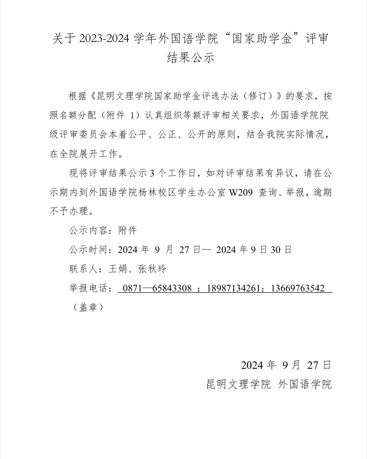 关于2023~2024学年外国语学院“国家助学金”评审结果公示