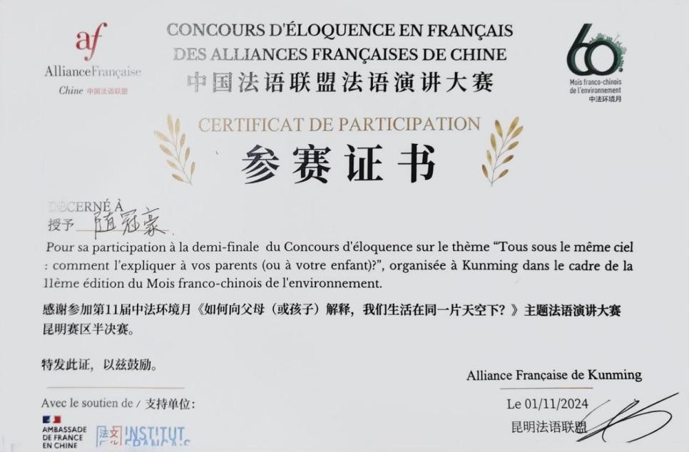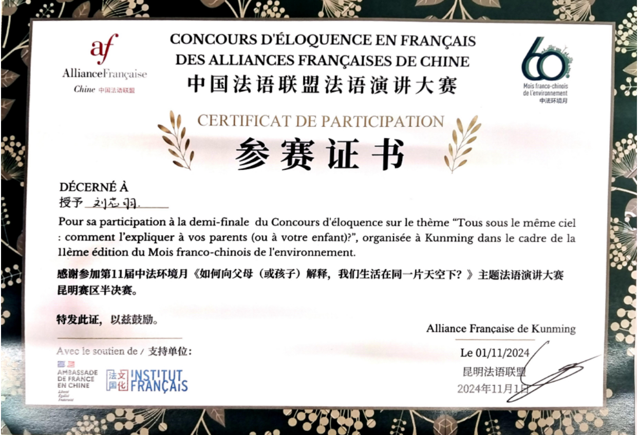 在法国驻华大使馆主办的2024中法环境月全国法语演讲比赛中,学院积极动员和指导12名学生参加初赛,其中2名选手晋级到西南地区半决赛。作为进入西南地区半决赛的唯一民办本科高校, 我院法语专业2022级学生随冠豪同学和刘芯羽同学在与来自四川外国语大学、云南大学、西南政法大学、西南林业大学、电子科技大学、成都师范学院等高校的22名选手角逐中,综合成绩进入前25%,受到在场评委的一致好评。
