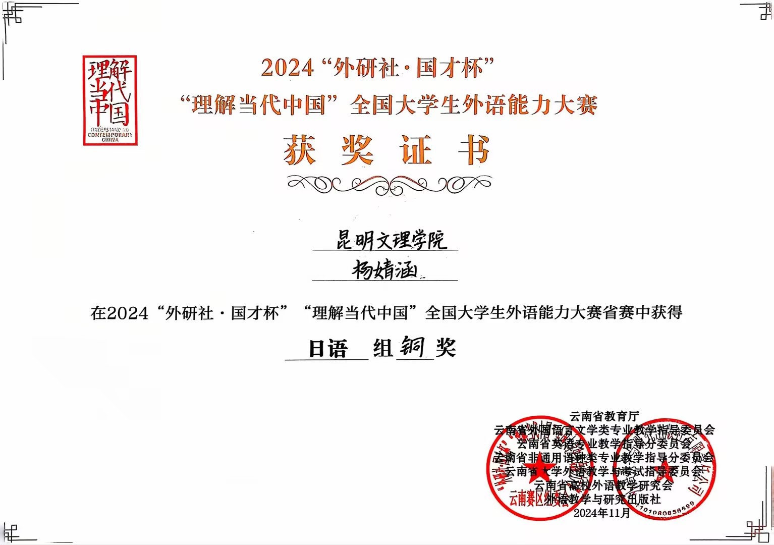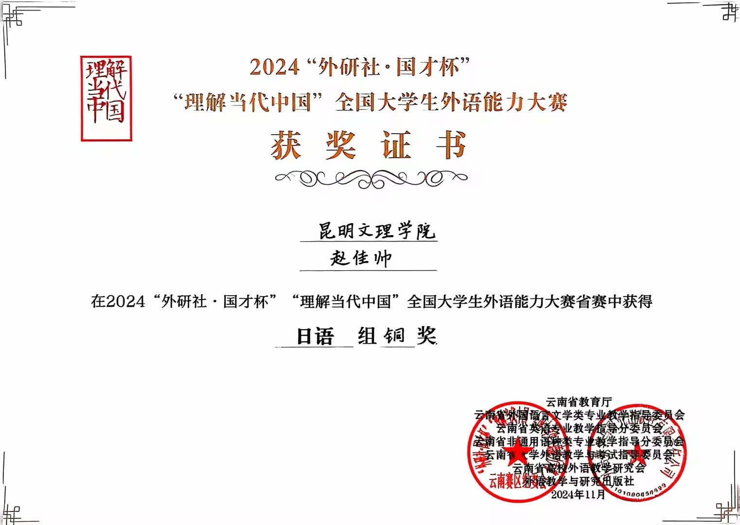 本次外研社国才杯"理解当代中国"多语种(日语、法语、西班牙语、阿拉伯语)省级比赛中,共评选出金奖7项、银奖12项、铜奖21项。其中,来自我院日语专业2021级学生周妍杉在激烈的竞争中脱颖而出,荣获日语组省级银奖,2021级学生杨婧涵和赵佳帅荣获日语组铜奖,为学校赢得了荣誉。