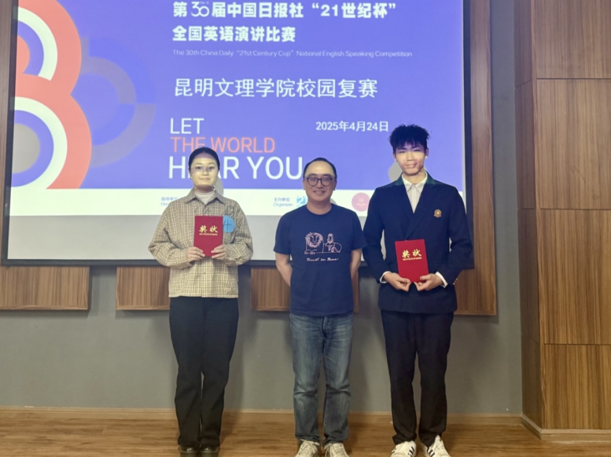 4月24日下午,2025年度中国日报社21世纪杯;全国英语演讲比赛昆明文理学院校级复赛在杨林校区C114隆重举行。经过初赛180名选手的激烈角逐,10位优秀学子脱颖而出,围绕主题Living within and beyond the 21st century;展开精彩对决。最终,翻译专业李映红同学与法语专业随冠豪同学凭借出色的表现斩获特等奖,将代表学校参加省级复赛。