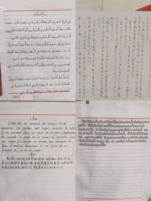 本次大赛突破传统形式,采用;线上 + 线下;双线联动模式,一经推出便吸引全校2400余名同学踊跃参与。参赛者们以笔为媒,将中文的行云流水、阿拉伯文的优雅曲线、西班牙文的明快洒脱、俄文的刚劲有力、英文的流畅舒展、日文的细腻精致、法文的浪漫隽永一一呈现于纸端。经过初赛、复赛的激烈角逐,最终 36 位书写佼佼者脱颖而出,站上决赛舞台。决赛现场,选手们屏息凝神、挥毫泼墨,将扎实的语言功底与独特的艺术创意融入每一笔书写,尽显语言之美与书写之韵。
