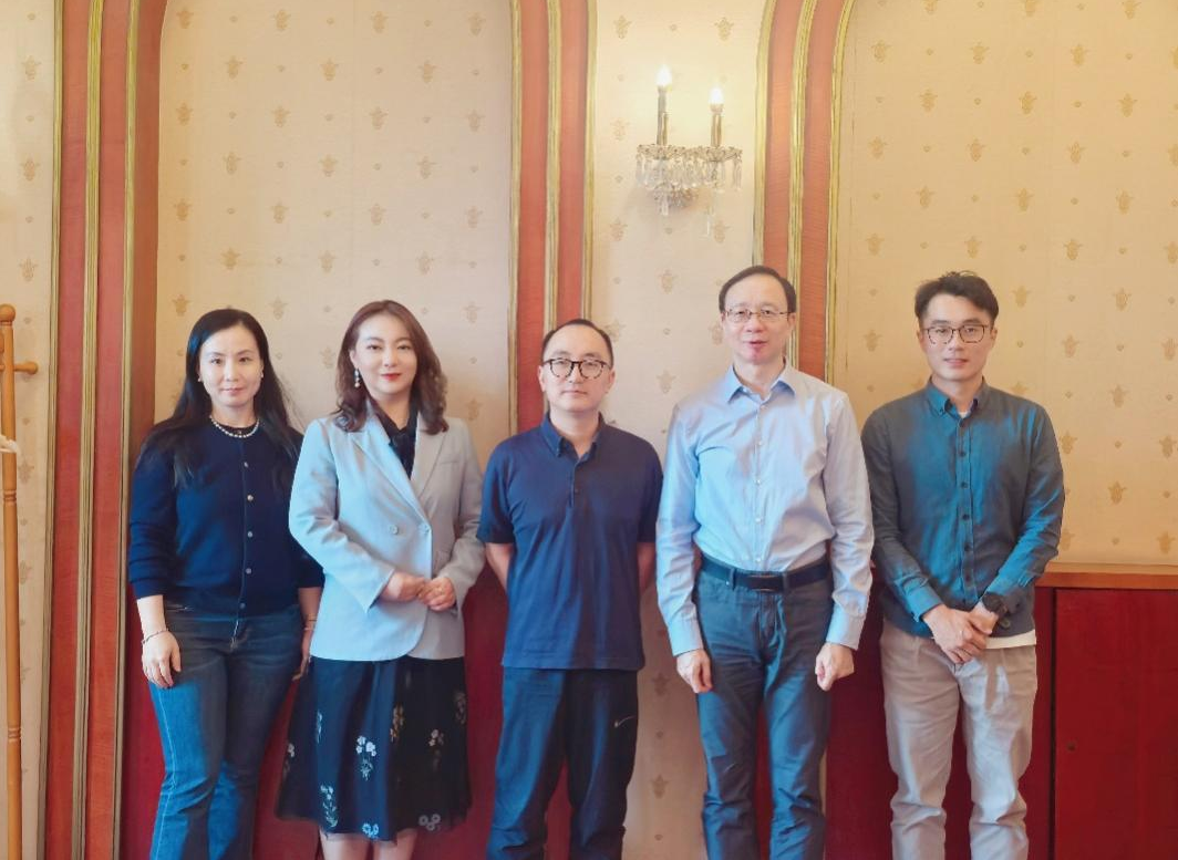 学校外国语言与国际传播学院院长邓国栋(左三)与上外法语系系主任王海洲(左四)共建交流)