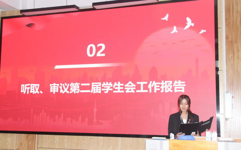 团委学生会副书记柯镜代表第二届学生会主席团作工作报告,全面回顾过去一年工作成果,涵盖思想引领、学风建设、校园文化活动及学生权益服务等方面;同时剖析不足,为下一届学生会工作提出可行建议,明确后续方向。