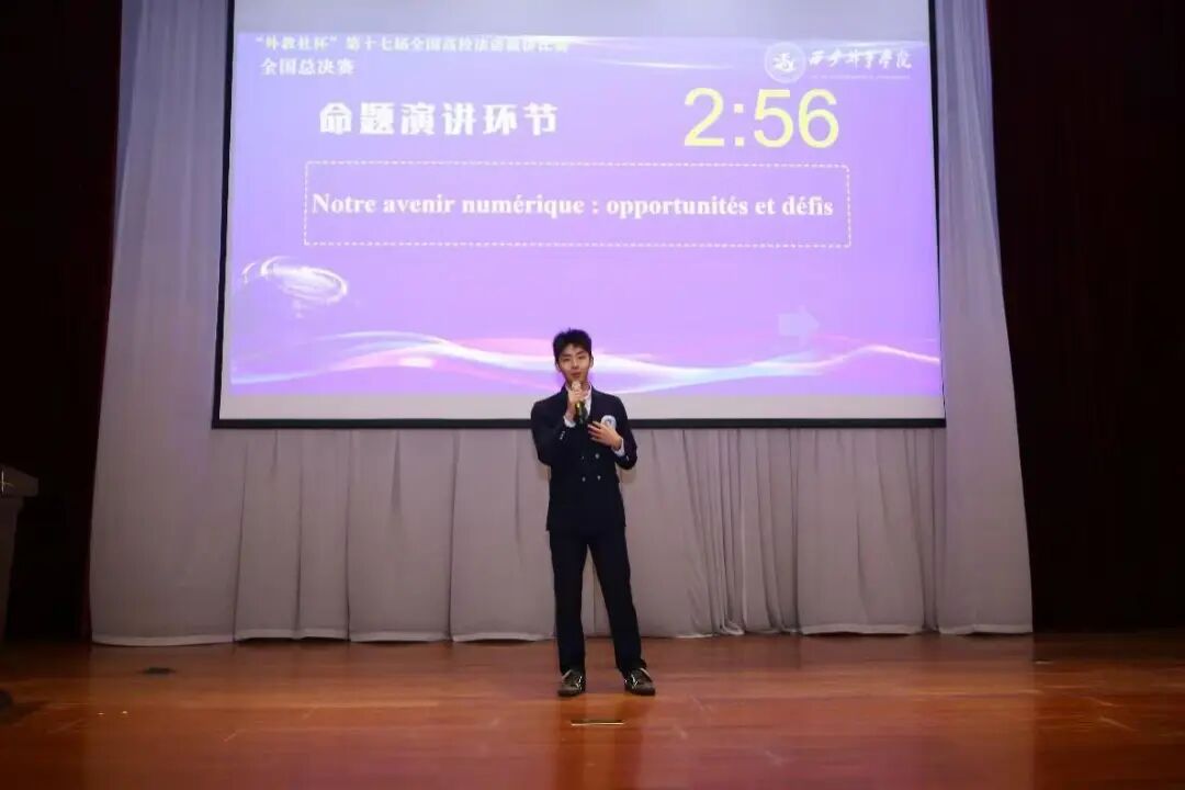 在总决赛的舞台上,比赛环节包含围绕指定主题的命题演讲和即兴演讲,面对教育部外语指导委员会法语分委员会专家和来自全国一百五十余个专业点的法语教师,全方位考察选手的语言表达能力、逻辑思维能力、知识储备水平和临场心理素质。此次定题演讲的主题为Notre avenir numérique: opportunités et défis(我们的数字未来:机遇与挑战),随冠豪同学以纯正的语音语调、流畅的表达和富有见地的内容,讲述西安历史文化遗产数字化保护的故事。在即兴环节中,随冠豪抽中选题La sur-information quotidienne(日常信息过载),他沉着冷静、从容面对,充分展现了我校学子的精神风貌,顺利完成比赛。