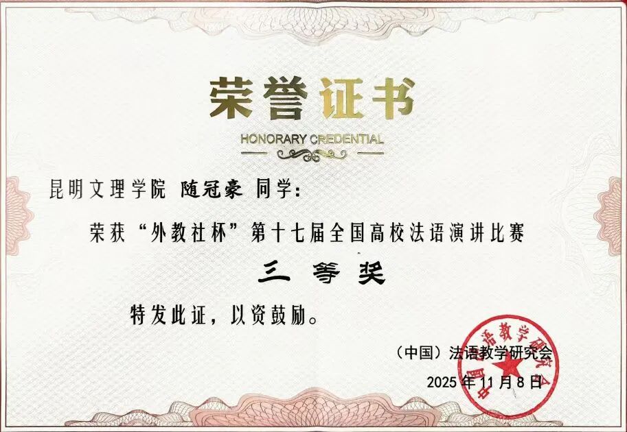 2025年11月8日,外教社杯第十七届全国高校法语演讲比赛全国总决赛成功举办,昆明文理学院2022级法语专业学生随冠豪荣获三等奖。